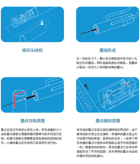 混合缸里的墨水通過(guò)供給泵加壓,從噴嘴中噴出柱狀液體。柱狀液體經(jīng)過(guò)晶振的振動(dòng),確定墨水粒子的大小。每一個(gè)墨水粒子會(huì)有對(duì)應(yīng)的電壓使之帶電,帶電后的墨水粒子在高壓偏轉(zhuǎn)電極之間通過(guò)時(shí),根據(jù)其自身的帶電量,確定自己的偏向,到達(dá)噴印物表面。